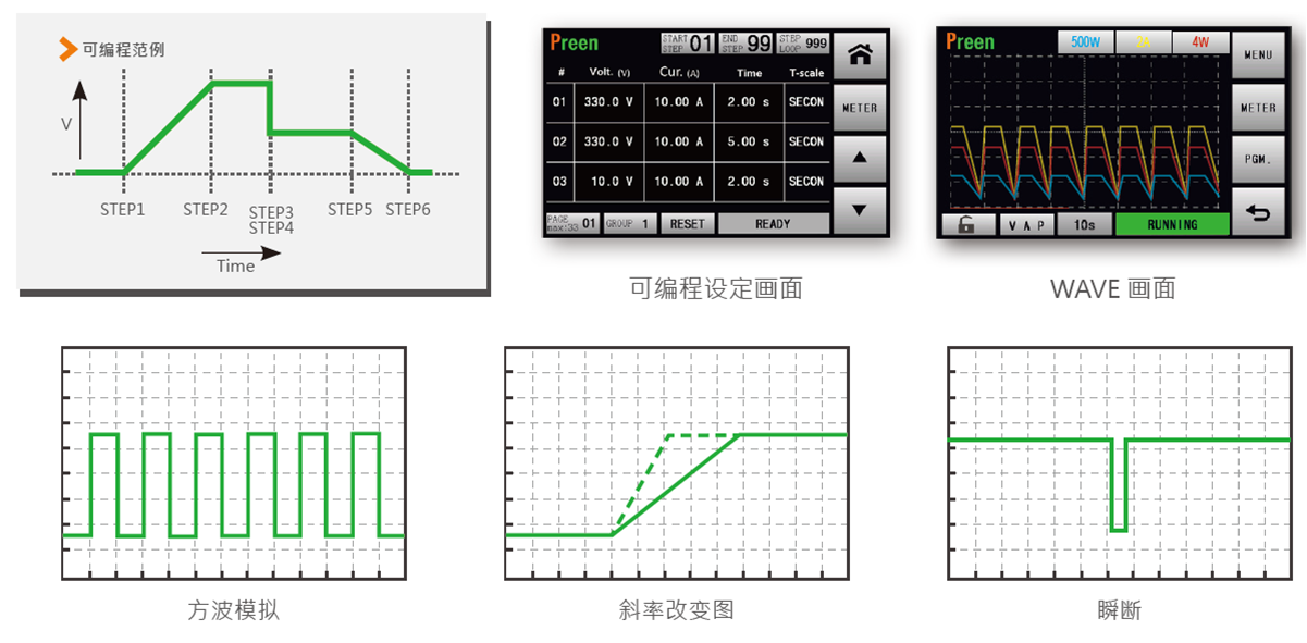 ?  輸入電壓范圍測試:具GROUP和STEP,可設定階段式或連續的電壓與電流變動,也可改變爬升和跌落速度,或模擬電源瞬時斷電情形,不需編寫程序,即可做多項電源模擬。