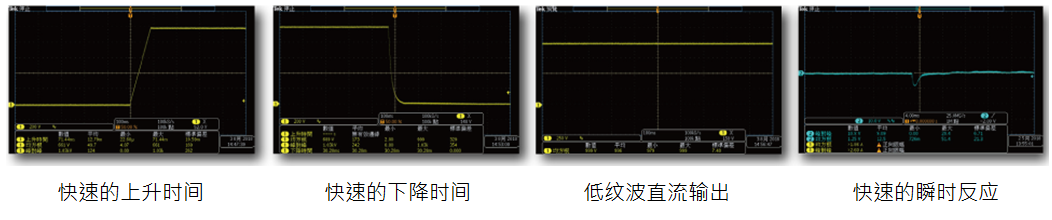 ?  瞬時反應與開關機時間測試:以低紋波、高精度、高穩壓率的特性,搭配快速的反應速度和爬升率,適合高效率地模擬各種直流電源測試。