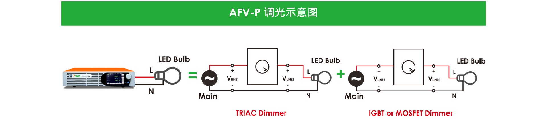 Preen的 AFV-P是一款輸出可達(dá)2000 Hz,并兼具交流輸出以及直流輸出的測(cè)試電源產(chǎn)品。內(nèi)建的 「相位角調(diào)光」 功能,可達(dá)到TRIAC與IGBT等調(diào)光器的效能來(lái)模擬前沿調(diào)光與后沿調(diào)光,適用于IEC60598-1, GB7000.1, CNS14335 等相關(guān)標(biāo)準(zhǔn)法規(guī)的驗(yàn)證,透過(guò)電壓相位的變化來(lái)改變輸出端通過(guò)LED燈的電流,借此達(dá)到調(diào)整LED燈不同亮度的測(cè)試目的。